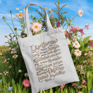 Eco-friendly cotton tote featuring iconic Harry Potter spells. Durable, reusable, and perfect for wizards, witches, and everyday carry.